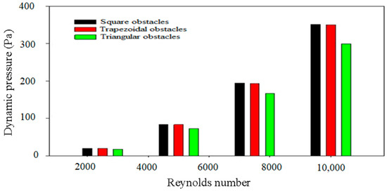 For the three types of obstacles, 0° < θ < 45°, Figure 7 shows the dynamic pressure fluctuation as a function of the Reynolds number (Re = 2500, 5000, 7500, and 10,000). Remember that pressure increases every time the Reynolds number increases. As can be seen, the pressure values for the square and trapezoidal obstacles are extremely close to each other. In addition, compared to the two preceding situations, the pressure value in the triangular case is relatively low.