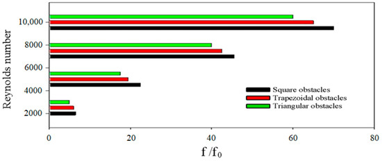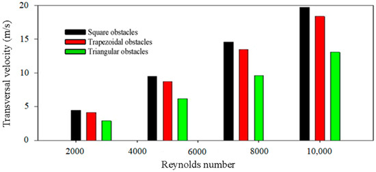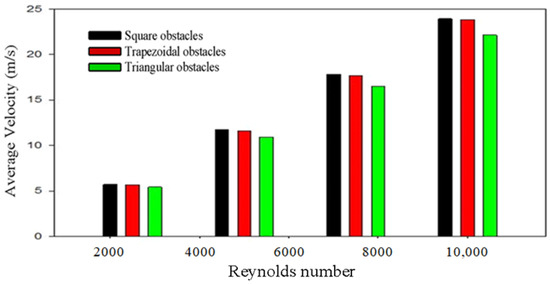 The distribution of the average velocity as a function of the Reynolds number is shown in Figure 9. Keep in mind that the average velocity increases as the Reynolds number increases. Additionally, we discover that for Reynolds values 2000–6000, the average velocity in the three instances was quite similar. Reynolds number 6000 indicates that the average velocity dropped in the case of the triangular obstacle and stayed constant in the situations of the square and trapezoidal obstacles.