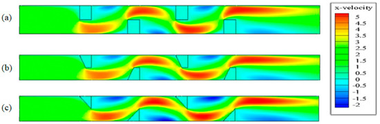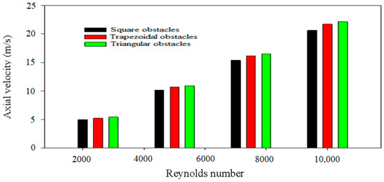 For the square, trapezoidal, and triangular examples under study, the fluctuation of the axial velocity is depicted in Figure 10. As a result of the obstacle, it can be seen that the flow is actually accelerated. For the flow’s perfect straightening upstream of a triangular obstacle, axial velocity is crucial. Velocity is affected in the case of the trapezoidal obstacle. However, because of the vortex that is created in the square case, the velocity varies.