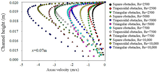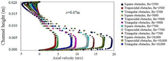At x = 0.07 m and for various values of the Reynolds number in each of the cases taken into consideration, Figure 11 shows the fluctuation of the axial velocity as a function of the height of the channel. When the channel height is between 0 and 0.015 m, it is shown that the velocity increases, and that the velocity increases as the value of the Reynolds number increases. If we use a Reynolds number to examine the axial velocity profiles for the three models, we find that the square and trapezoidal obstacle models have nearly identical velocities.