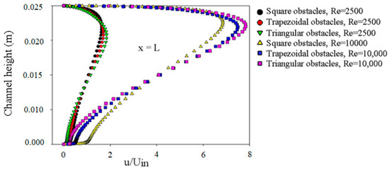 The profiles of the ratios at the channel’s outflow (x = L) are shown in Figure 13. These profiles demonstrate that for the smallest Reynolds number, Re = 2500, the ratios are similar. The ratios (at the point 0 up to 0.01 m) of the model with a triangular obstacle are low for the maximum Reynolds number, Re = 10,000. For the square obstacle, the model has high ratios . The model with a triangular obstacle has large ratios at positions 0.01 to 0.018 m.