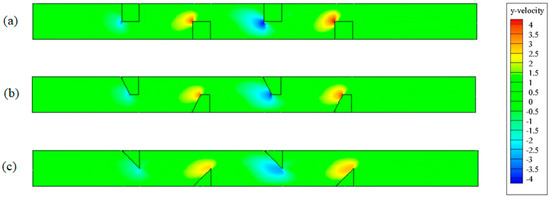 Figure 15 shows how the vertical (transverse) velocity varies in the three cases of the triangle, trapezoid, and square. With the exception of the head of the obstacles, the transverse velocity is homogeneous throughout the duct of the channel. However, at the left extremities of the upper and lower obstacles, the velocity assumes positive and negative values, respectively. Upstream of a square obstacle, the velocity is high because of the abrupt pipe section reduction.