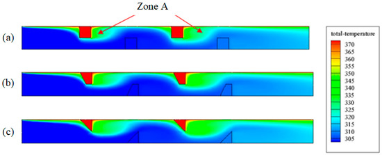 The temperature field is depicted in Figure 17. Forced convection causes the air near the absorber to heat up quickly the secondary air in the lower part of the channel downstream of the upper obstacles in Zone A; this suggests that the temperature is high for the three models under consideration. It has been shown that the square obstacle’s weak flow recirculation results in minimal contact between the cold air and the obstacle. Due to the obstacle’s diversion of the flow in the trapezoidal cases, we see that there is good turbulence. We obtain good cooling in the triangular instance because the interaction between the cold air and the impediment is significant downstream of the obstacle.