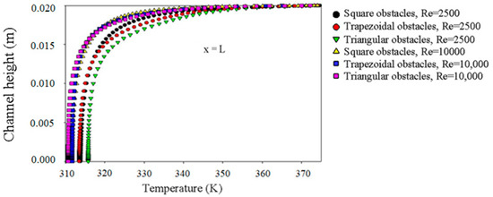 The temperature change at the channel’s exit is shown in Figure 18 for a range of Reynolds number values and obstacle types. With increasing pipe height, the fluid temperature profile rises exponentially with a different curve for each value of the Reynolds number. Due to the substantial heat flux that heats the surface, the triangle obstacle has the maximum heat transfer. The temperature value at the middle of two configurations is what causes the trapezoidal obstacle to have an average heat flow (between square and triangular). Due to the cooling air temperature, the square obstacle has the weakest heat transmission (poor cooling). It can be concluded that the temperature values of the model channel with triangle obstacles are very high. The three models’ temperatures are comparable when the Reynolds number is raised to 10,000.