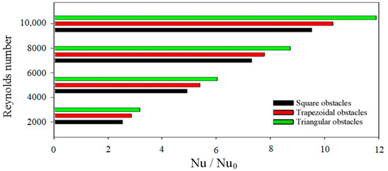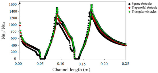 Figure 19 shows how the square, trapezoidal, and triangular shapes of obstacles affect the evolution of the adimensional Nusselt ratio with channel length. Depending on the width of the channel, the Nusselt number fluctuates sinusoidally between obstacles.