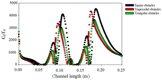 The profile of the local friction coefficient along the channel (upper wall) in the three cases: square, trapezoidal, and triangular for Re = 2500.