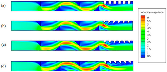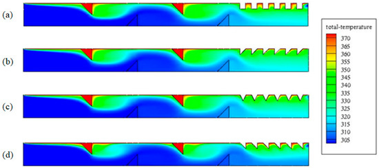 The temperature field in the four cases of roughness: (a) square roughness, (b) triangular roughness Type 1, (c) triangular roughness Type 2, and (d) triangular roughness Type 3 for Re = 2500.