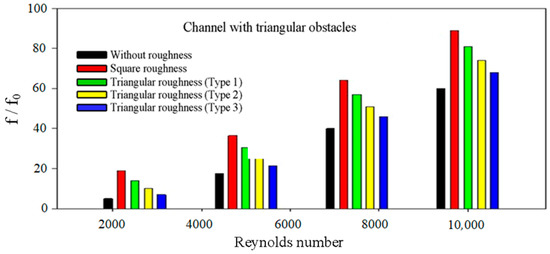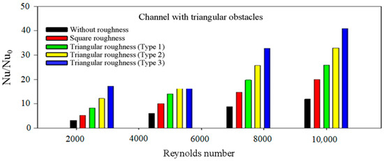 Due to the flow’s effective guidance, the figure demonstrates that the average Nusselt number is large in the case of triangular roughness Type 3. Due to the regular separation of the flow, the Nusselt number is decreased in the case of triangular roughness Type 2.