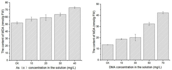 3.3. Effects of Arsenic Stress on the MDA Content in Honeysuckle Leaves