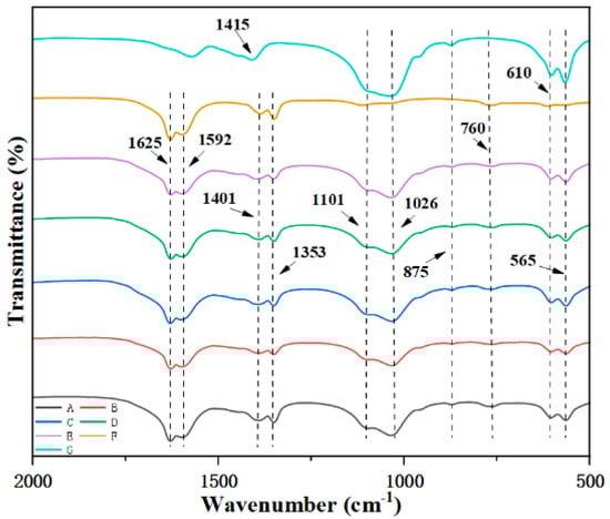 FT-IR images of fish scale biochar (A), non-reductive drying of silver ions (B), silver ion reduction drying (C), non-reductive calcination of silver ions (D), silver ion reduction calcination (E), fish scale (F), and hydroxyapatite (G).