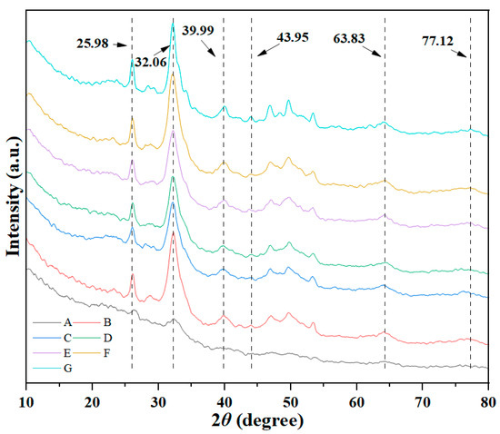 Figure 2 displayed the XRD patterns of different fish scale biochar antibacterial materials (B, C, D, E, and F) and fish scale and hydroxyapatite antibacterial materials. The diffraction peaks (2θ) at 39.99°, 43.95°, 63.83°, and 77.12° were ascribed to the Ag element [47], verifying that silver ions are reduced to silver nanoparticles upon contact with sodium citrate dihydrate and in the subsequent carbonization process. Figure 2 illustrated that the diffraction peaks of hydroxyapatite in different fish scale biochar antibacterial materials were 2θ = 25.98° and 2θ = 32.6°, respectively. By comparing the original fish scales and hydroxyapatite antibacterial materials, we see that the antibacterial material of the treated fish scale biochar corresponded exactly to hydroxyapatite, which was the substance in the fish scale [48].