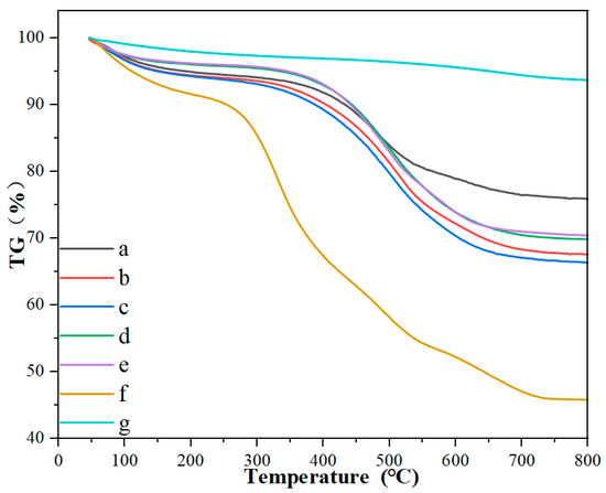 TG images of fish scale biochar (a), non-reductive drying of silver ions (b), silver ion reduction drying (c), non-reductive calcination of silver ions (d), silver ion reduction calcination (e), fish scale (f) and hydroxyapatite (g).