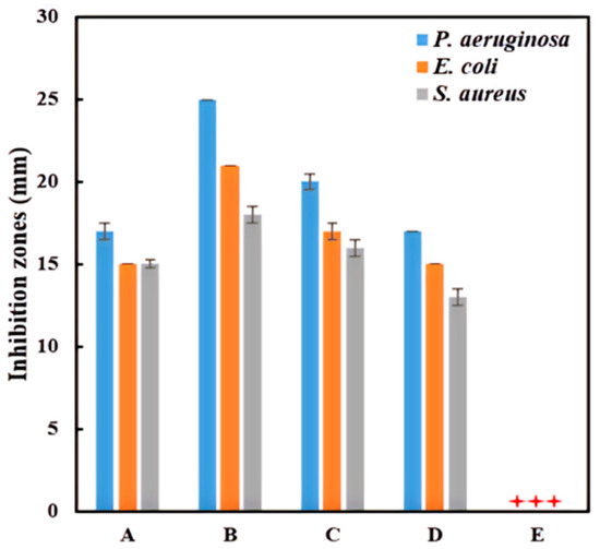 Briefly, 100 μL bacterial suspension (S. aureus, P. aeruginosa, and E. coli) with initial concentration of 108 CFU/mL was uniformly coated in solid medium. The holes were drilled in the agar medium using a hole puncher. The composite materials (B, C, D, and E) were added to the holes and A was utilized as a control test cultivation at 37 °C for 24 h; E. coli growth was observed around the material. The bacteriostasis test was repeated three times to check the reproducibility of the results.