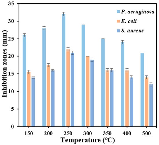 The calcination temperature might influence the antibacterial effect [47], and the results are given in Figure 7. When the calcination temperature was between 250 and 500 °C, the antibacterial effect of the F/C–Ag composite material decreased. This shows that the bacterial inhibitory activity of F/C–Ag dropped after calcination at 250 °C for 2 h. The calcination temperature would influence the antibacterial property of nanoparticles, and the antibacterial activity might drop with increasing calcination temperature [58].