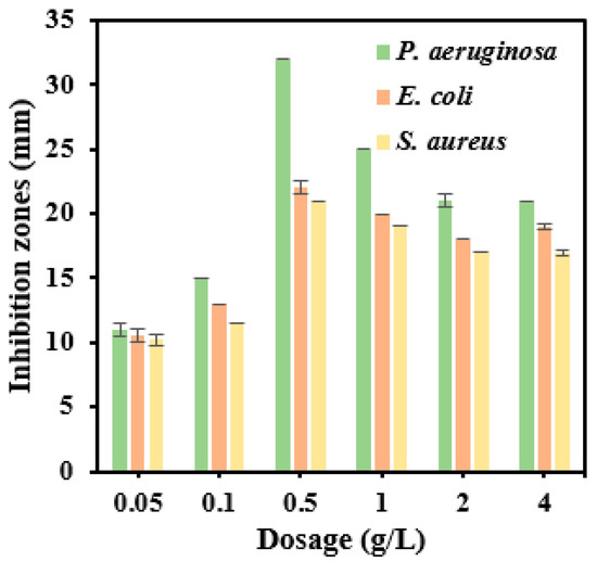 At low silver ion concentrations, the inhibition zone size might be improved with the increase in silver ion dosage [59]. Figure 8 depicted that the bacteriostatic effect became more obvious with the increase in silver nitrate dosage in the range of 0.05–0.5 g/L under the optimal production process. When the concentration of silver nitrate was in the range of 0.5–4.0 g/L, the bacteriostatic effect dropped with the increasing concentration of silver nitrate. In other word the bacteriostatic effect decreased with the increase in silver nitrate concentration. In the process of silver ion reduction by adding sodium citrate dihydrate, high silver ion concentration would cause the aggregation of silver ion functional groups [60]. Silver ions could not be uniformly attached to the surface of fish scale biochar, which led to the reduction and stabilization of the antibacterial effect when silver nitrate dose was increased. When silver nitrate was 0.5 g/L, the size of the microbial inhibition zone of the silver-loaded carbon was 18 mm [56], while the antibacterial zone of the F/C–Ag material reached more than 30 mm. Thus, the F/C–Ag material had good antibacterial activity.