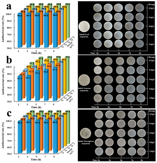 As revealed in Figure 9c, the F/C–Ag composite had excellent antibacterial effect in the antibacterial experiment of P. aeruginosa. When the dosage of the F/C–Ag composite material was 0.2 g/L and the antibacterial time was 1 h, the antibacterial effect reached 98.5%. When the time was reached 9 h, no viable colonies could be seen via the plate counting method. After the treatment with the F/C–Ag composite (>0.2 g/L) for 3 h, only a single colony could be seen via the plate counting method. When the concentration continued to rise to 1 g/L, no residual colonies were found in the plate count. Therefore, for the antibacterial experiment of E. coli, the appropriate antibacterial dosage of the F/C–Ag composite was 0.2 g/L, and the optimal antibacterial time was 1 h. In the antibacterial test of S. aureus, the optimum bacteriostatic dosage of the F/C–Ag composite was 1 g/L and the optimum bacteriostatic time was 9 h. In the antibacterial experiment of P. aeruginosa, the optimal antibacterial dosage of the F/C–Ag composite was 0.2 g/L and the optimal antibacterial time was 3 h. P. aeruginosa is one of the most common bacteria present in the soil [63]. The drug resistance of Pseudomonas is strong, and thus the antibacterial effect of natural antibacterial materials dropped [64]. The antibacterial properties of nanometal particles were uneven [9]. In the antibacterial test of P. aeruginosa, the antibacterial rate reached 99% at the F/C–Ag composite dosage of 0.2 g/L for 3 h. This proves that the composite antibacterial material had a good application prospect.