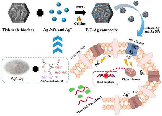 The antibacterial properties of F/C–Ag composites are closely related to silver ion sterilization [65]. So far, the definitive mechanism of microbial death involving AgNPs is unknown. Figure 10 showed the antibacterial diagram of the F/C–Ag composite. Low-temperature calcination would make the structure of the fish scale loose and the reduced silver nanoparticles might better adhere to the fish scale carbon. The repeatability test verified that the silver nanoparticles were firmly loaded on the composite material. F/C–Ag composites showed good performance in all the antibacterial tests. It proved that substantial AgNPs were released during the antibacterial process. The F/C–Ag composite containing AgNPs released silver ions and diffused them into bacteria through the ion channels. This could be ascribed to their high affinity for biomolecules with sulfur and phosphorus groups present in bacterial membranes [13]. The interaction of AgNPs with mitochondrial respiratory enzymes led to the proliferation of reactive oxygen species, which eventually caused the destruction of ion transport channels and membrane proton gradients, disruption of many cellular metabolic processes (such as DNA synthesis, protein, and enzyme synthesis), and bacterial death [66]. The AgNPs with positive charge had a good antibacterial effect on a wide range of bacteria in the study of silver ion inhibition [59]. According to the results of the antibacterial experiments, it was speculated that there were a lot of positively charged AgNPs in the F/C–Ag composite.