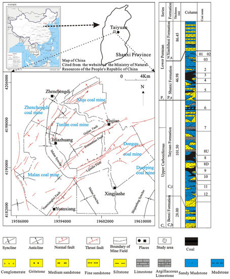The Taiyuan Xishan Coalfield is located in the outer zone of the east wing of the “Qilu-Helan” structure, at the southern end of the Yangqu–Yuxian east–west structural belt. The coalfield is connected to the Fenhe Structural basin in the southeast, which belongs to the central zone of the North China Craton [4,5,6,7].