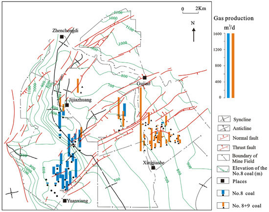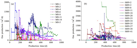 Production data of coalbed methane wells in the research area were collected at Xishan Lanyan Coalbed Methane Limited Liability Company, including daily water and gas production at different well locations. Coalbed methane wells produce different amounts of gas and water at different stages [26]. Compared with the southern Qinshui basin, the Gujiao Block produced less gas. In the southern Qinshui basin, the gas production of CBM wells is mostly greater than 2000 m3/d [17], while that in the Gujiao Block is mostly less than 1000 m3/d, and the gas production decreases gradually after 400 days when the drainage and mining are carried out (Table 1). The average gas production in the first 600 days of a coalbed methane well was analyzed. High-gas-production wells (500 to 1000 m3/d), medium-gas-production wells (200 to 500 m3/d), and low-gas-production wells (less than 200 m3/d) of No. 8 coal accounted for, respectively, 3%, 40%, and 57% of the total number of wells (Figure 2a). High-gas-production wells, medium-gas-production wells, and-low gas-production wells of No. 8 and 9 coal accounted for, respectively, 5%, 20%, and 75% of the total number of wells (Figure 2b). Therefore, regardless of whether it is a single layer or a composite layer, and no matter the working area, the average gas production is usually less than 200 m3/d. As can be seen from the plane layout, a large number of faults developed in the study area. The gas production was significantly low near the fault and increased far away from the fault. This may be related to the migration and dispersal of CBM. The gas production of CBM wells near the core of the syncline is higher (Figure 3).