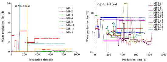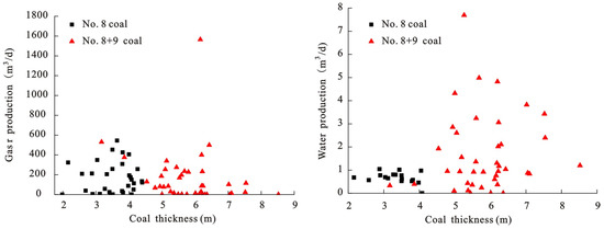 The thickness of No. 8 coal in the study area ranges from 1.57 to 5.22 m, with an average of 3.26 m. The thickness of No. 9 coal ranges from 1.33 to 4.64 m, with an average of 2.55 m. The thickness of No. 8 and 9 coal ranges from 3.17 to 8.52 m, with an average of 5.81 m. Traditionally, it is believed that the greater the thickness of the coal seam, the more abundant the CBM that flows to the wellbore and the higher the CBM production [16,34]. However, the correlation between coal thickness and gas production in this region is poor. In general, the thickness of No. 8 and 9 coal is greater than that of No. 8 coal, but the gas production did not increase significantly (Figure 9).