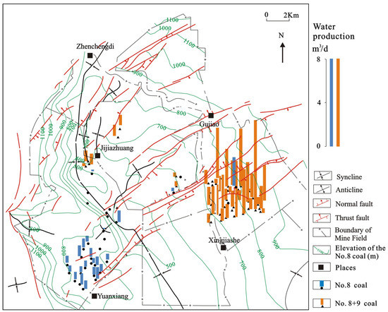 The influence of a single factor may be important in coalbed methane development in a certain region. However, for most areas, the production of CBM depends on a comprehensive reflection of all kinds of main control factors [42]. The No. 8 coal and No. 9 coal in Gujiao Block are characterized by a deep burial depth and good thickness condition, poor permeability, and poor gas content. The tectonic and hydrological factors are the main factors that influence gas production and water production. The coalbed methane development effect observed here is relatively inferior. In addition to the improvement of the drainage system and the improvement of the transformation mode, the geological control factors are the primary considerations. In the southern study area, the Xingjiashe well field is located in the core of the syncline, and the fault is not developed. The groundwater in this area is retained, which is conducive to the enrichment and preservation of CBM. This area may be a favorable area for CBM mining.