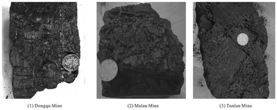 The coal rank in the study area is significantly different, classified into fat coal, coking coal, lean coal, and meagre coal [36]. The fracture system in the coal reservoir is extremely developed (Figure 11). The surface cleat extends from 5 to 6 cm, the end cleat extends from 2 to 3 mm, and the spacing between end cleats ranges from 3 to 4 mm. The proportion of primary structure coal is 60% [37].