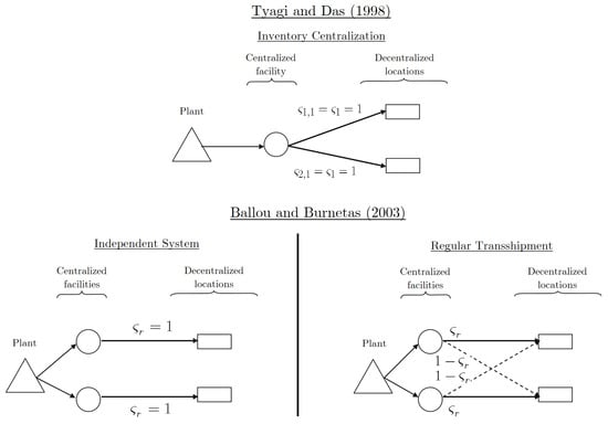 A centralized inventory is given when all decentralized locations are served by a single centralized location, while a regular transshipment (RT) occurs when all decentralized locations are served by all centralized locations. This approach can significantly reduce demand variability at individual points and often lead to cost savings compared to an IS [,,].