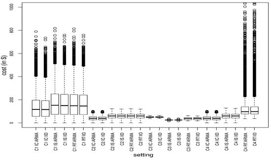 For the 10,000 scenarios under both IID and dependent frameworks, we statistically compare the parts of CC1 to CC4 of the TC for IC, RT, and supply IS. As mentioned, note that Case B analyses the four cost components CC1-CC4, while Case A only considers CC1-CC3. To graphically compare these cost components between the combinations of IC, RT or IS supply, and IID or ARMA DPUT, we show the distribution of the corresponding cost values in Figure 3. From this figure, we can see that component CC1 has the largest median cost. For the dependent framework, we analyzed the number of scenarios with CC1 as the higher cost than the other components, with 6347, 7721, and 8858 cases for RT, IC, and supply IS in Case B. We found similar results under IID DPUTs. Furthermore, the cost values of CC1-CC4 were again tested using a statistic for differences on proportions. Significant differences were detected in favor of CC1 under IC, RT, and supply IS, for DPUTs using both with or without time-dependence frameworks. Therefore, we detected CC1 as the crucial component of the TC. Similar results were found for cases A by comparing CC1-CC3. Then, we used the Wilcoxon statistic to test the medians of the costs associated with CC1 obtained by IC, RT, and supply IS for DPUTs considering frameworks with or without time-dependence. We conclude that there are no statistically significant differences at 10% between medians for components of TC under both frameworks.