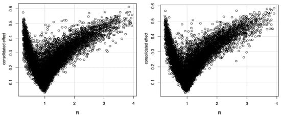 According to [], the consolidated effect metric formulated in (31) may be a response variable modeled by a linear function of . From the scatter-plots of Figure 4 with (left) independent and (right) dependent frameworks for the DPUTs, note that approximately linear forms are identified. Then, we consider a linear regression model to analyze the behavior of the consolidated effect metric. The estimated regression coefficients, standard errors, and t-test p-value, with temporal dependence for both and , related to the consolidation effect, are reported in Table 5.