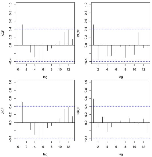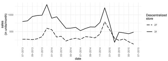 We considered the two demand points that contain sufficient history to fit an ARMA model: the demand points #27 and #31. We call these demand points the decentralized stores. The data considered are shown in Table 6 and graphically represented in Figure 5. Descriptive statistics for both demand points are detailed in Table 7. From this table, graphically supported by Figure 5, note that demand point #31 has demand mean and SD greater than stock point #27. Plots of the autocorrelation function (ACF) and partial ACF (PACF) are simple techniques to find temporal DPUT patterns. The reader is suggested to see [] for an explanation of these graphical plots. To check the temporal dependence of sales, we used the ACF and PACF for both demand points #27 and #31. Their graphical plots are shown in Figure 6, which suggest time-dependence in both time series. Given this result, we utilized the forecast library of the R software with its auto.arima function to fit an ARMA model and estimate its order as well as its parameters. Also, we used the Akaike information criteria (AIC) to select the better model, where a less value of AIC indicates a better fit of the model. The results coincide with the recommendation provided in Figure 6, since the fitted ARMA models are AR() and MA() for demand points #27 and #31, respectively. Furthermore, the estimated SDs conditioned on past data are 118.88 and 211.12 units, respectively.