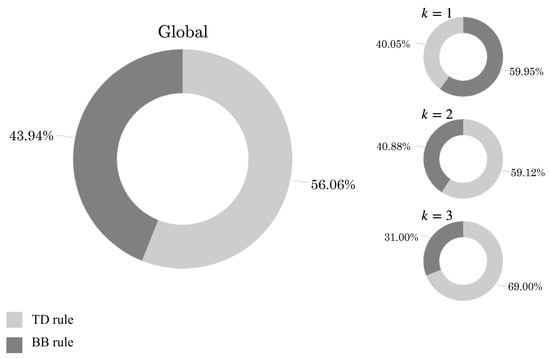 To evaluate the behavior of our model, we considered low, medium, and high values for the cost parameters of the proposed model, employing the metrics detailed in Section 3.1. Following [], we stated the safety factor parameter: ; OC: OC and OC; mean LTs: ; and SDs: . The proposed model was implemented for all possible combinations. The TCs were evaluated under the TD and BB rules and compared with TC under an IS. In this experiment, overall, 56.06% of the occasions have lower TC under the TD rule, while in 43.9% of the cases, the best decision was the BB rule. There are no lower TC under the IS. One of the most interesting findings resides in the choice of k. It is expected that, as k increases, the TC increases as well, regardless of the evaluated system. However, when , most decisions minimizing costs were made under the BB rule. In other cases, when , the TD rule minimized the costs in 59.12% and 69% of the cases, respectively. These results are shown in Figure 7.