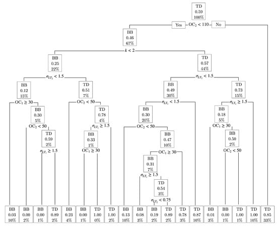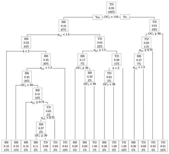 Nevertheless, it is possible to notice that, when the variability of the LT in centralized location 1 is low compared to the variability of the LT of location 2, the best decision also tends to make centralization in one location. Then, we applied a decision tree using the R software to detect deep patterns in the decision framework. Figure 8 shows the corresponding results. From this plot, we can observe that most decisions are related to LT and variability of the SS. Furthermore, we can observe a particular case when the OC is high with low OC. Then, the decision is to apply a centralization under the TD rule. This is expected because this allocation rule centralizes the inventories mainly in one dedicated facility. In this specific case, the solution is centralized in the facility with lower OC, that is, location 1, except for the presence of a high LT variance for facility 1 and lower LT variance for facility 2. In the case of the IID framework, the results are very similar. Note that examination of Figure 8 and Figure 9 shows that the safety factor is more critical. We can notice that there are no different patterns.