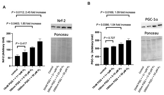In addition to concentration, the duration of exposure is also an important consideration. It is estimated that the concentration of H2 would have decreased to baseline (atmospheric) levels (i.e., <0.5 nM) within 30 min. However, such limited exposure appears to be enough time to induce biological effects such as induction of Nrf2. Moreover, repeated intermittent exposure to H2 (15 min per hour) was more effective than constant exposure in a rat model of Parkinson’s disease [35]. Finally, it should be noted that the C2C12 myoblasts were not exposed to cellular stress (e.g., radiation, H2O2, drugs, environmental pollutants, etc.), which is often required in order to unveil the cytoprotective effects of molecular hydrogen [20]. Indeed, if redox and metabolic homeostasis is already optimal, then we should not expect (or desire) significant changes from baseline. Future research is needed to determine the potential independent contribution of both PQQ and molecular hydrogen, particularly during times of cellular stress.