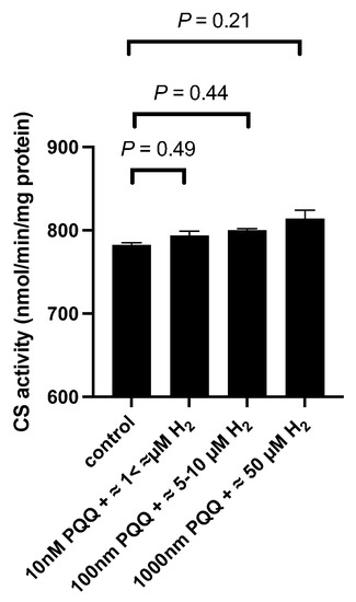 Nrf-2 is a transcription factor involved in regulating cellular resistance to oxidants and could be influenced by PQQ [19]. The significant mechanism in cellular defense is initiated by the phase II enzymes through stimulation of the Nrf-2-antioxidant response element (ARE) signaling pathway [20]. Nrf-2 is essential in regulating electrophile/antioxidant homeostasis. It provides support to the cell’s integrity and function, especially under conditions of oxidative stress. The Nrf-2/ARE signaling pathway helps to control the expression of over 200 genes that participate in antioxidation and detoxification [20]. Current research shows that Nrf-2 operates in a dominant way to promote neuroprotection because of its antioxidant response [21]. Collectively, it is believed that PQQ can impact both PGC-1α and Nrf-2, while also influencing citrate synthase activity, a marker for mitochondrial content in cells and tissues [3,22]. Indeed, PQQ has been demonstrated to increase citrate synthase activity, which was blocked in PGC-1α knockdown using small interfering RNA [3].