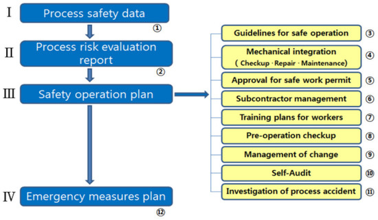 The PSM system was expanded from 21 types of substances to 51 types in 2014, and was implemented in all workplaces in 2015, resulting in an increase in the submission of process safety reports from small and medium-sized businesses [15]. Process safety reports are classified into four contents: ① process safety data, ② process risk evaluation report, ③ safety operation plan, and ④ emergency measures plan. They are also composed of 12 detailed elements that work together organically, as shown in Figure 1 [27].