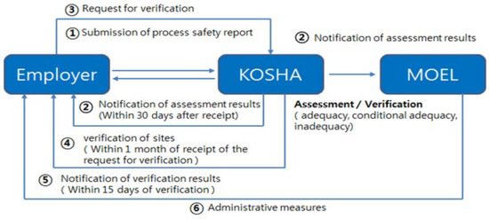 If a business owner establishes or moves a harmful and dangerous facility or alters its major structural part, as determined by the Ministry of Employment and Labor (MOEL), the owner shall prepare a process safety report and submit it to the MOEL within 30 days for a review, as prescribed by the Ordinance of the MOEL, and the MOEL will provide a written notice of the results of the review to the relevant business owner within 30 days, as shown in Figure 2. In cases where it is deemed necessary to maintain and promote the safety and health of employees, the MOEL may order amendments to the relevant process safety report. MOEL conducts a compliance evaluation of PSM within two years after the confirmation of the process safety report and classifies the results into four grades—P, S, M+, and M—based on the evaluation [35]. A re-evaluation will be conducted during the future evaluation period, as shown in Table 1.