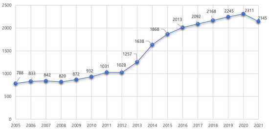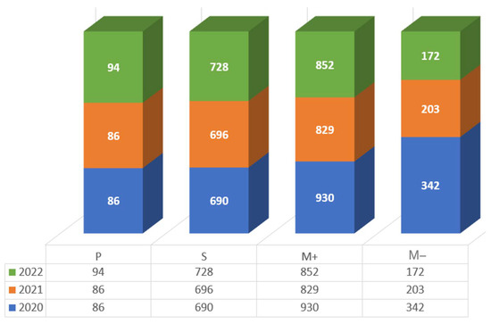 To analyze the current status of PSM operations, a survey was conducted on business establishments that have been subject to PSM submissions over the past 17 years, as shown in Figure 3 [9]. In 2005, there were 788 companies, but by 2021, approximately 2.7 times more (2145 companies) were subject to PSM submission. As mentioned earlier, business establishments’ subject to PSM submission must undergo re-evaluation for one to four years, depending on their evaluation grade. Figure 4 shows the PSM grades for the past three years, excluding establishments that were not assigned PSM grades. Based on the PSM evaluation grades for the past three years, it can be analyzed that P-grade establishments accounted for 4.7% of the total, S-grade establishments for 37.2%, M+ grade establishments for 45.8%, and M-grade establishments for 12.4%. The level of PSM improved annually. In particular, in 2022, the M+ and M− grades decreased by 8.4% and 49.7%, respectively, indicating a relatively higher increase in P and S grades.