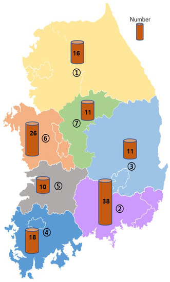 The following analysis examines the occurrence of major industrial accidents by region, dividing the country into seven regions based on geographical characteristics, as shown in Table 5 and Table 6. Each of the seven regions has individual industrial characteristics based on their geographical features. For example, regions ① and ⑦ are known for their semiconductor industry, while regions ①, ②, and ⑤ are known for their automobile industry. Regions ②, ④, and ⑥ are home to large-scale industrial complexes for petrochemical and oil refining industries, which are representative industries of Korea. Additionally, region ① has a high concentration of small and medium-sized businesses in the machinery, dyeing, and plating industries. As shown in Figure 5, regions ②, ④, and ⑥ where representative petrochemical and oil refining industries are located, have relatively high occurrences of major industrial accidents, accounting for 63% of the total. In addition, in region ①, which has many small and medium-sized businesses, the second-highest number of major industrial accidents occurred, as shown in Table 5 and Table 6.