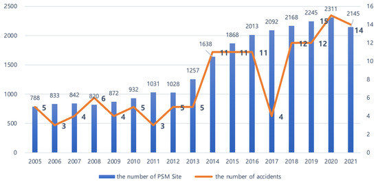 Looking at the occurrence of major industrial accidents since 2005, it can be seen that there were fewer than six incidents each year until 2013. However, from 2014, the number of incidents increased to 11, 12, or 15. This was due to the expansion of the scope of PSM-targeted workplaces since 2014 and the clarification of the definition of major industrial accidents, which resulted in a rapid increase in the number of targeted workplaces and accidents. The government defined a major industrial accident as “an accident that causes one or more injuries due to a fire, explosion, or leakage in PSM equipment”, to improve the issue of the previous unclear definition of major industrial accidents and to strengthen the autonomous safety management of workplaces to prevent such accidents, as shown in Figure 6.