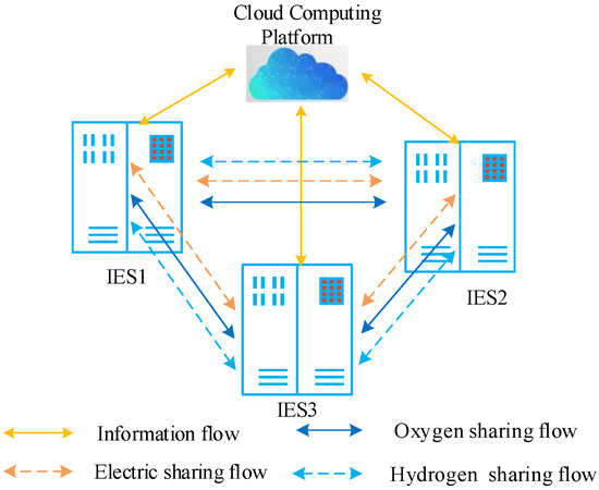 For multiple regional IESs, RE and loads have different characteristics. IES clusters are formed by interconnecting adjacent IESs, and coordinated operation is achieved through large-scale energy mutual assistance and complementary advantages. This method can improve the economy of each IES, thus generating higher cost advantages. The IES multi-energy sharing architecture is depicted in Figure 1, where interactive cluster information flows through a CCP and multi-energy sharing comprises electricity, oxygen, and hydrogen sharing. Heat sharing within IES clusters is not taken into account due to substantial pipe heat losses. The IES multi-energy sharing flow is based on conventional electric sharing, as well as oxygen and hydrogen, which are energy sources with extremely low transmission losses, are shared. This can partially replace the function of energy storage and achieve multi-energy sharing among IES clusters, substantially increasing the overall system scheduling flexibility and partially substituting the function of energy storage.