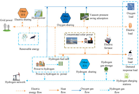 The IES architecture is shown in Figure 2, and it typically includes demand response load and units for CSP, HP, PHP, VPSA, EF, RE and hydrogen charging stations, etc. The oxygen could be combined with the VPSA to supply oxygen loads, while the hydrogen generated by P2H could be used by HFCs, as well as hydrogen sharing and hydrogen charging stations, resulting in efficient energy utilization.
