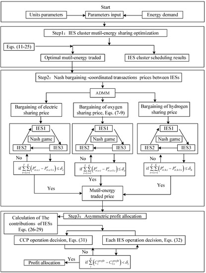 The optimization flowchart in Figure 3 depicts three processes: IES cluster multi-energy sharing optimization, Nash bargaining-coordinated transaction prices between IESs, and asymmetric profit allocation.
