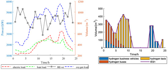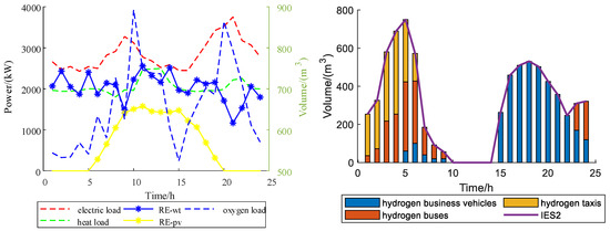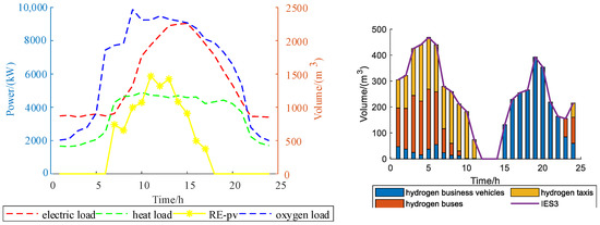 Figure 4, Figure 5 and Figure 6 shows typical loads, RE and HEVs for each IES. Typical loads include electricity, heat, and oxygen. IES1 refers to wind turbine (RE-wt) output, IES2 refers to the wind turbine (RE-wt), and photovoltaic (RE-pv) output and IES3 refers to photovoltaic (RE-pv) output.
