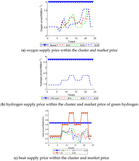- Through multi-energy sharing, energy complementation between each IES is promoted. The optimal energy sharing amount under the minimum operating cost is determined by IES cluster optimization, which conducts multi-Nash games on the sharing prices of electricity, oxygen, and hydrogen, with each IES as the main body and the cluster’s minimum sharing cost as the goal.
