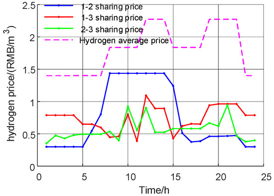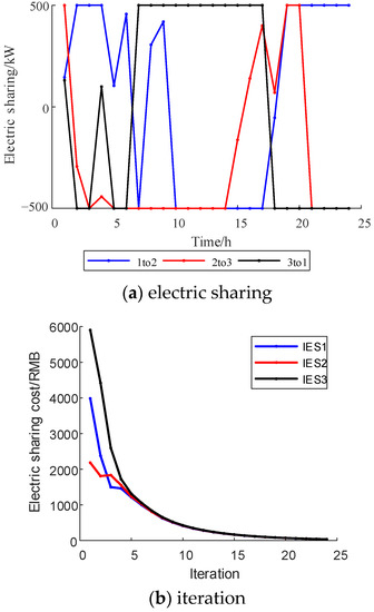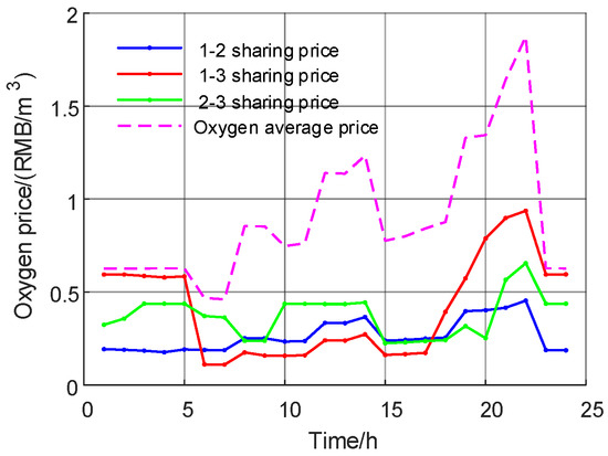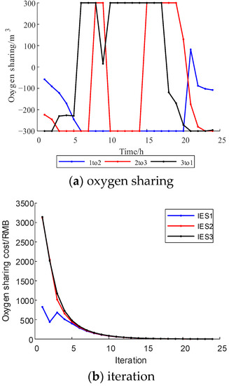 Figure 9 and Figure 10 show the optimization results of the multi-Nash game of electric sharing. Based on the IES cluster power supply price, the electric sharing cost is RMB 11,943.44 (USD 1648.76). After the multi-Nash game, the sharing price between IES clusters is significantly reduced to RMB 122.94 (USD 16.97). Figure 11 and Figure 12 show the optimization results of the multi-Nash game of oxygen sharing. Based on the IES cluster oxygen supply price, the oxygen sharing cost is RMB 1512.30 (USD 208.77). After the multi-Nash game, the shared oxygen sharing price among IES clusters is significantly reduced to RMB 3.63 (USD 0.50). Figure 13 and Figure 14 show the optimization results of the multi-Nash game of hydrogen sharing. Based on the IES cluster hydrogen supply price, the hydrogen sharing cost is RMB 7085.10 (USD 978.08). After the multi-Nash game, the hydrogen sharing price between IES clusters is significantly reduced to RMB 3.96 (USD 0.55).