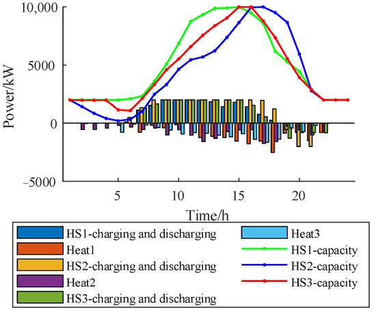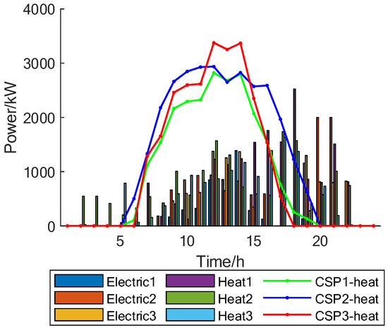 Taking the CSP as an example, the dispatching result of CSP is shown in Figure 15, and the HS dispatching in CSP is shown in Figure 16. Compared to the traditional CHP, the flexibility of both is approximately the same. The low carbon and construction cost of CSP is higher than that of CHP, the energy supply cost is lower than that of CHP, and the IES cluster can reduce the cost of CSP through cost sharing.