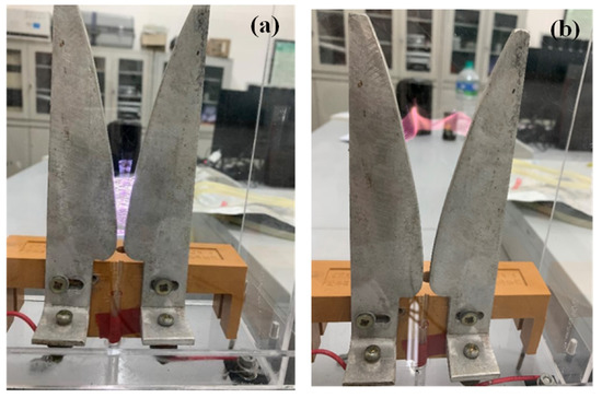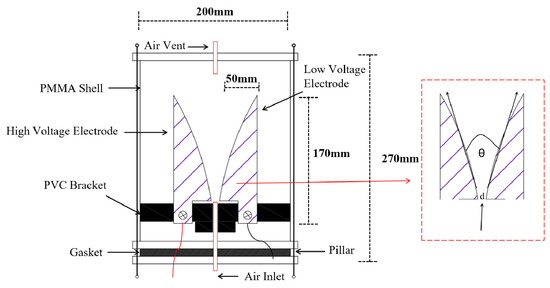A gliding arc plasma device made in the laboratory is shown in Figure 1. The gliding arc plasma device is composed of a blade-shaped electrode, an electrode fixed-end base, and a reaction outer shell. The bottom of the fixed-end seat can be adjusted by adjusting the bolts to facilitate changes in the spacing and angle of the knife electrode. The reaction outer shell is made of a PMMA cylinder with a diameter of 200 mm and a height of 270 mm. In addition, pipe ports with an inner diameter of 5 mm and an outer diameter of 7 mm are set up at the top center of the shell to be used for the air intake and outlet of the air pump (HLVP6-NB12, Shanghai, China).