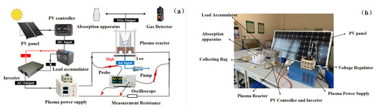 The photovoltaic-driven gliding arc discharge plasma test platform used in the experiment is shown in Figure 2a. The experimental equipment mainly includes the following: photovoltaic module (200 W, Hunan Advanced Technology, Changsha, China), photovoltaic inverter, battery, high voltage AC power supply (CTP-2000K, Nanjing Suman, Nanjing, China), air pump, digital oscilloscope (DS1052D, Beijing RIGOL, Beijing, China), and gliding arc plasma device (self-made in the laboratory). The reactor was powered using a high-voltage pulse power supply (CTP-2000K). The plasma voltage and current were measured using a high-voltage probe (Tektronix PP510), and the same probe was used to measure the voltage of resistance. The output voltage measurement interface of the power supply is attenuated by 1000:1, and the relevant amplitude parameters of the output power supply read on the oscilloscope should be multiplied by 1000 to obtain the real voltage. A physical diagram of the device is shown in Figure 2b.