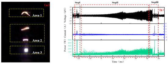 This typical electrical signal feature mainly occurs after the blade electrode is energized. From the arc development stage, when the gliding arc forms a bright channel and moves to the upper end of the electrode for a short distance, the stage repeatedly breaks down in area 3, as shown in Figure 3a, and the arc breakdown occurs in the gap at the bottom of the electrodes. This stage also corresponds to step Ⅰ shown in Figure 3b, which is the firing stage of the gliding arc. The gliding arc plasma nitrogen fixation process also requires the help of the air flow field to push the arc gliding along the electrode and streamline direction, which is most of the area contained in the electrode length. The arc extends and elongates in area 2 shown in Figure 3a. From the arc developmental stage, the color of the gliding arc also changes from bright channel color to flame color. This stage corresponds to step Ⅱ of Figure 3b, which is the developmental stage of the gliding arc. When the plasma power supply is insufficient, the gliding arc is extinguished at the bottom of the blade electrodes. This stage is extinguished in area 1 shown in Figure 3a, and a bright channel is regenerated in area 3 shown in Figure 3a for a periodic cycle. This stage corresponds to step Ⅲ shown in Figure 3b, which is the arc extinguishing stage of the gliding arc. Similarly, when the AC signal is no longer supplied to the blade electrode, the gliding arc is eliminated. The arc also remains extinguished, and the waveform in the experiment is similar to that in [22].