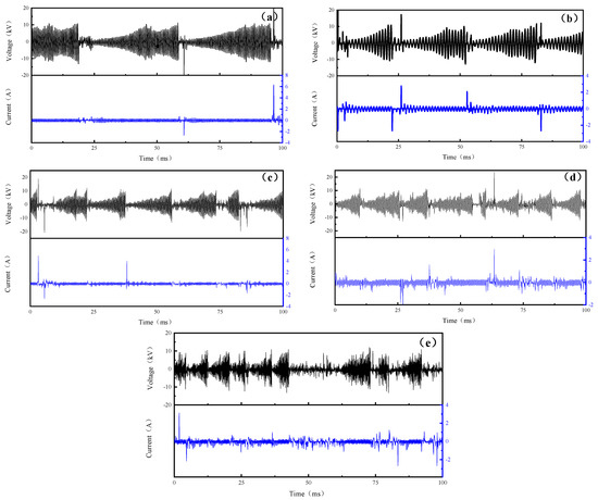 Voltage and current waveform under different air flow rates. (a) 0.8 L/min; (b) 1.6 L/min; (c) 2.4 L/min; (d) 3.2 L/min; (e) 4.0 L/min.